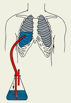 В хірургічному стаціонарі в першу чергу встановлюють чрезкожный плевральний дренаж. Функція його полягає у виведенні повітря з плевральної порожнини. Застосовується дренаж по Бюлау: один кінець трубки встановлюють у плевральну порожнину, а на кінець іншого надягають гумову рукавичку з отвором на пальці і опускають у таз з водою. При вдиху зайве повітря буде виходити, а при видиху клапан з рукавички буде перешкоджати його вступу назад.