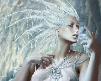 Біла шапочка з опушкою, накладна коса. Блакитний довгий халат, прикрашений блискучими гірляндами, сніжинками, опушенням і шматочками вати. Вийде ось така ось дівиця-красуня, та не проста, а чарівна!