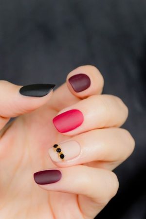 Тим, хто любить яскраві але не хоче яскравого манікюру, можемо порекомендувати манікюр з кількома відтінками червоної гами на різних нігтях. Це незвично, красиво, досить яскраво, але не химерно.