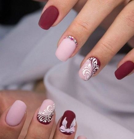 Червоний манікюр може бути дуже різним. У більшості цей відтінок викликає асоціацію з жінками-вамп і яскравими тонами. Але якщо вибрати приглушений червоний, доповнити його рожевим і білими малюнками, то вийде дуже ніжний манікюр на всі випадки життя.