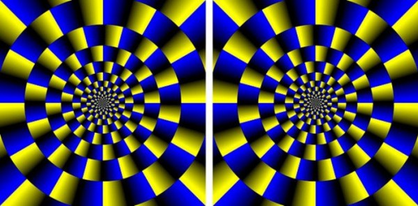 На нерухомих зображеннях нам бачиться обертальний рух, зумовлений грою форми і кольору. Але обидві картинки абсолютно статичні.