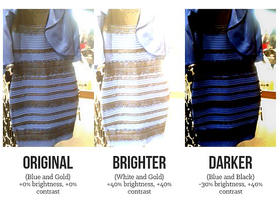 Сприймаючи зображення сукні, людина на підсвідомому рівні домысливает освітлення і фон. Якщо мозок мимоволі приймає за істину сонячне освітлення, то сукня такій людині здається біло-золотим. Якщо мозок відштовхується від штучного (електричного) освітлення, плаття буде здаватися синьо-чорним.