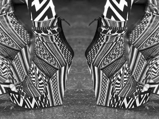 Взуття з «фотографизмами» Вазарелі візуально має ефект вібрації, завдяки особливому розташуванню чорно-білих ліній і штрихів.