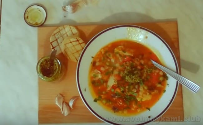 Залишилося лише декілька штрихів: після того як ви розлили суп по тарілочках, посипте його базиліком, додайте сир або червоний мелений перець. Крім того, з цим супом відмінно поєднується знаменитий соус «Песто», так що обов’язково поставте на стіл соусницю.