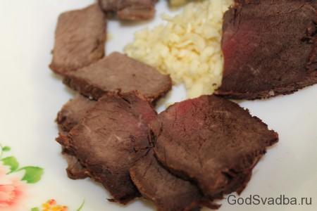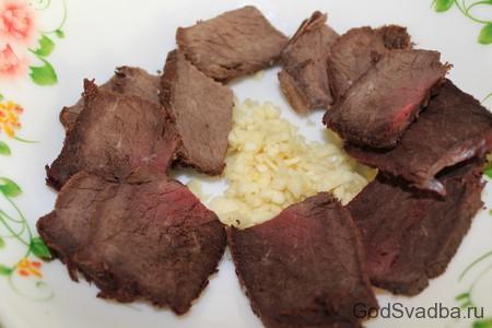 - Тим часом шматки м’яса охололи і можна їх порізати. Що ми і робимо, нарізаючи м’ясо акуратними тонкими, приблизно половина сантиметра завтовшки, квадратами.