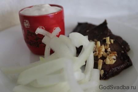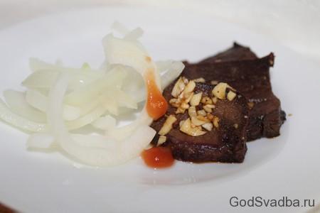 - Викладемо На тарілку кілька шматочків м’яса, додамо маринований цибулю і поставимо соусницю.