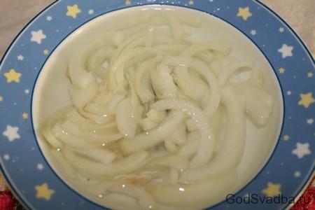 - Замочуємо в цю водичку цибулю і залишаємо на півгодини. Нехай маринується.