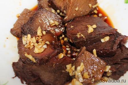 - Туди ж кидаємо підготовлене м’ясо і заливаємо все соєвим соусом. Зрозуміли, чому м’ясо солити не потрібно було? В соусі солі і так цілком вистачає.