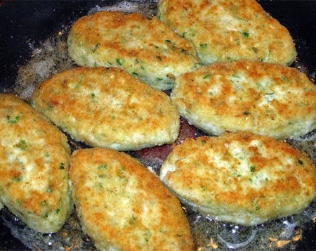 - Змоченими водою руками формуємо з отриманої суміші невеликі котлетки і обвалюють їх в панірувальних сухарях, або в манці. Обсмажуємо наші котлети з двох сторін (5-7 хвилин з однієї сторони і стільки ж з іншого) в киплячому рослинному маслі. Домігшись золотистого кольору і хрусткої скориночки у котлет, зменшуємо вогонь, додаємо трохи води, накриваємо сковороду кришкою і доводимо нашу страву до повної готовності. Це займе ще приблизно хвилин сім-десять.