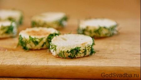 Спочатку підготуємо основу канапе – хліб. Суть в тому, що форма тостів повинна бути акуратна і невелика. Знайдіть у себе велику кришку з-під пляшки, діаметром близько п’яти сантиметрів. Хліб наріжте на тости за 1.5-2 см в ширину. З допомогою кришки виріжте хлібні кола. Підсушіть їх з двох сторін на сухій сковорідці. Далі займемося відразу прикрасою. Дрібно кришимо кріп, поки хліб остигає. Торці скибочок змащуємо тонким шаром вершкового масла і катаємо їх за кропу, щоб він прилип. Має вийти як на фото.