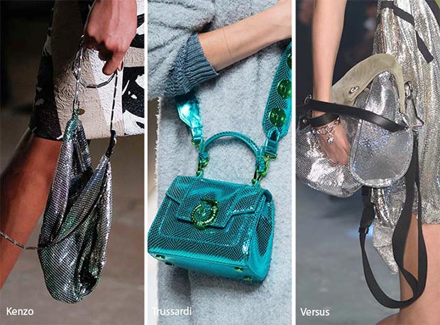 Металеве покриття є небезпечним вибором, оскільки є знаковим трендом 80-х. Однак, коли воно змішується з іншими тканинами і унікальними формами, то стає сучасним і унікальним, так що не дивно, що чимало блискучих сумок стало частиною весняних тенденцій в 2017.