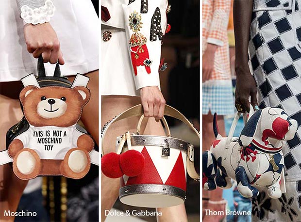 У Moschino, сумки були замасковані під таблетки-контейнери, плюшевих ведмедів, і навіть під альпіністський рюкзак. Для того, щоб походити на музиканта, сумки від Dolce & Gabbana, прийняли форму барабанів, гітар, крихітного піаніно і навіть кубика Рубіка.