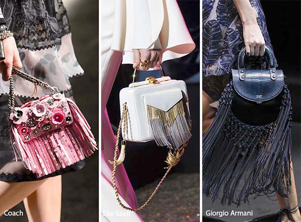 У Elie Saab, тенденція бахроми була в поєднанні з металевими матеріалами. Це було зроблено для досягнення ефекту розкоші і шику. Золоті кутаси звисали по обидва боки плечового ремінця сумки-коробки, в той час як срібна бахрома обрамляла передній кишеня з білої шкіри.