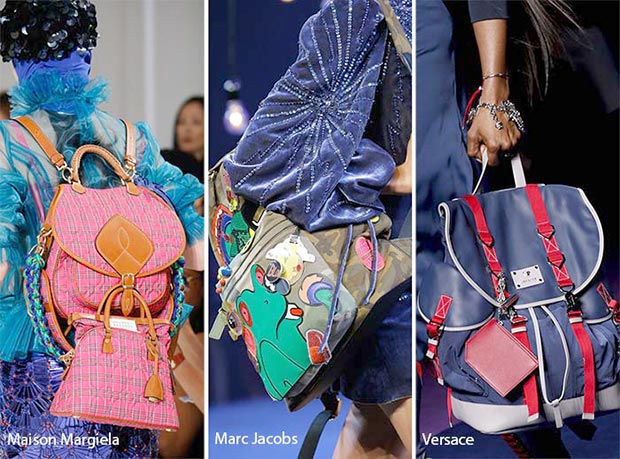 Рюкзаки від Версаче більше походили на гламурну екіпіровку для скелелазіння завдяки суміші пластикових ремінців та срібною фурнітури. У Maison Margiela, ми побачили рюкзаки, виготовлені з плюшевих матеріалів у відтінках білого і оранжевого, які ідеально підходять для повсякденного життя, але без спортивного мотиву, на відміну від сумок інших дизайнерів.