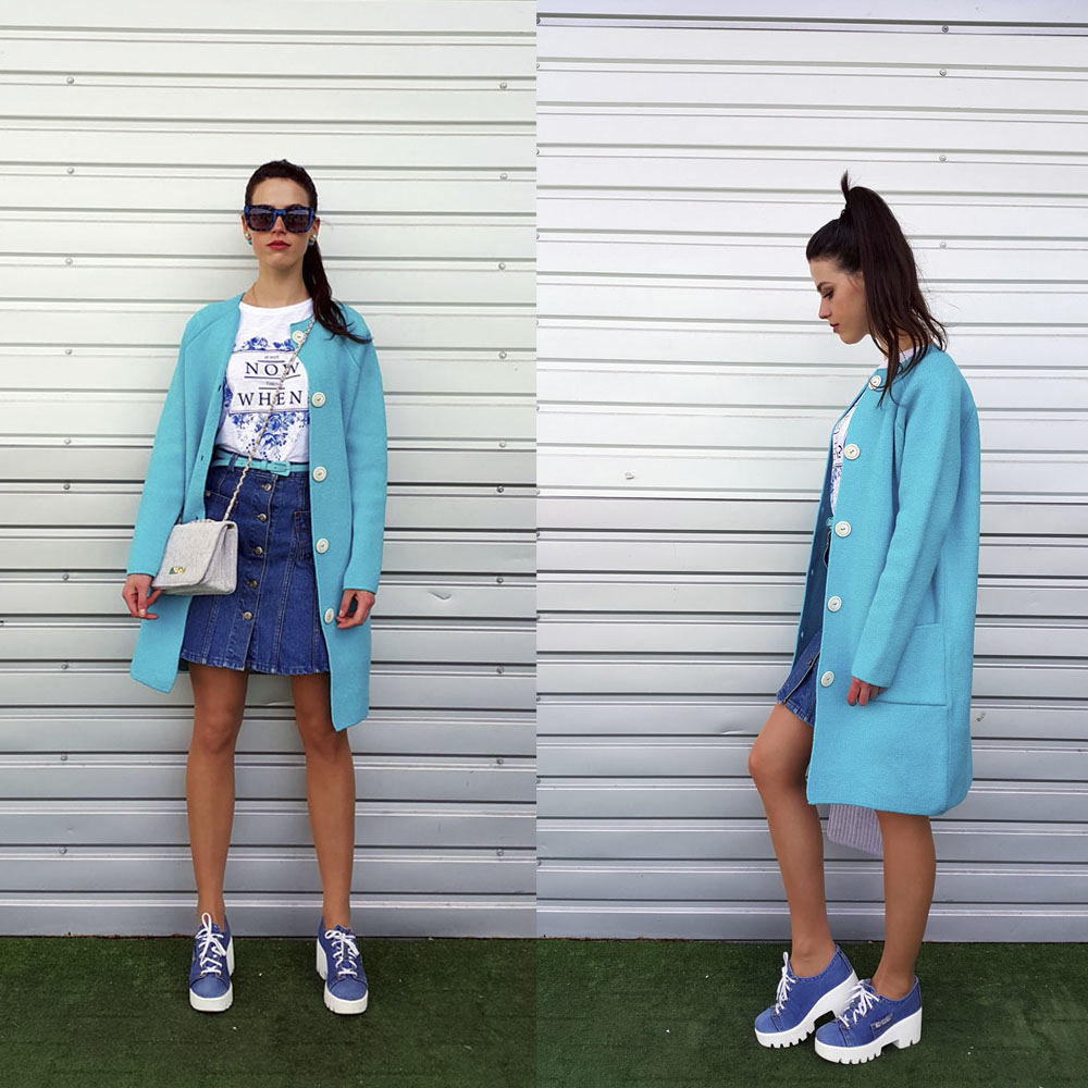 - Стильний джинсовий комбінезон білого кольору разом з тонким синім поясом ідеально підійде під таке взуття. Можна надіти яскравий капелюшок, прикрашений синім бантом.