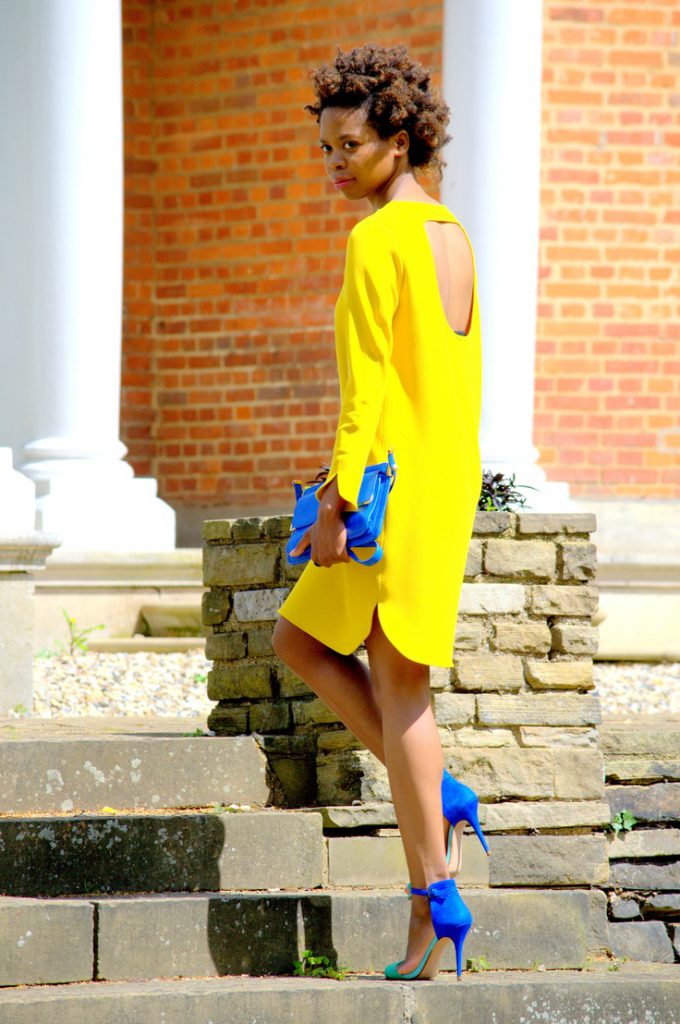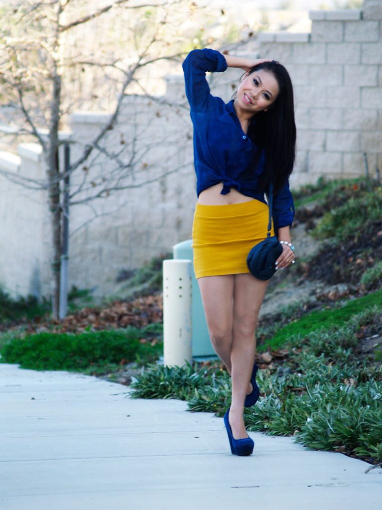 - Обтягуючий наряд жовтого кольору буде контрастувати з синіми босоніжками і створювати неповторний образ. Рекомендується надягати лакове взуття.