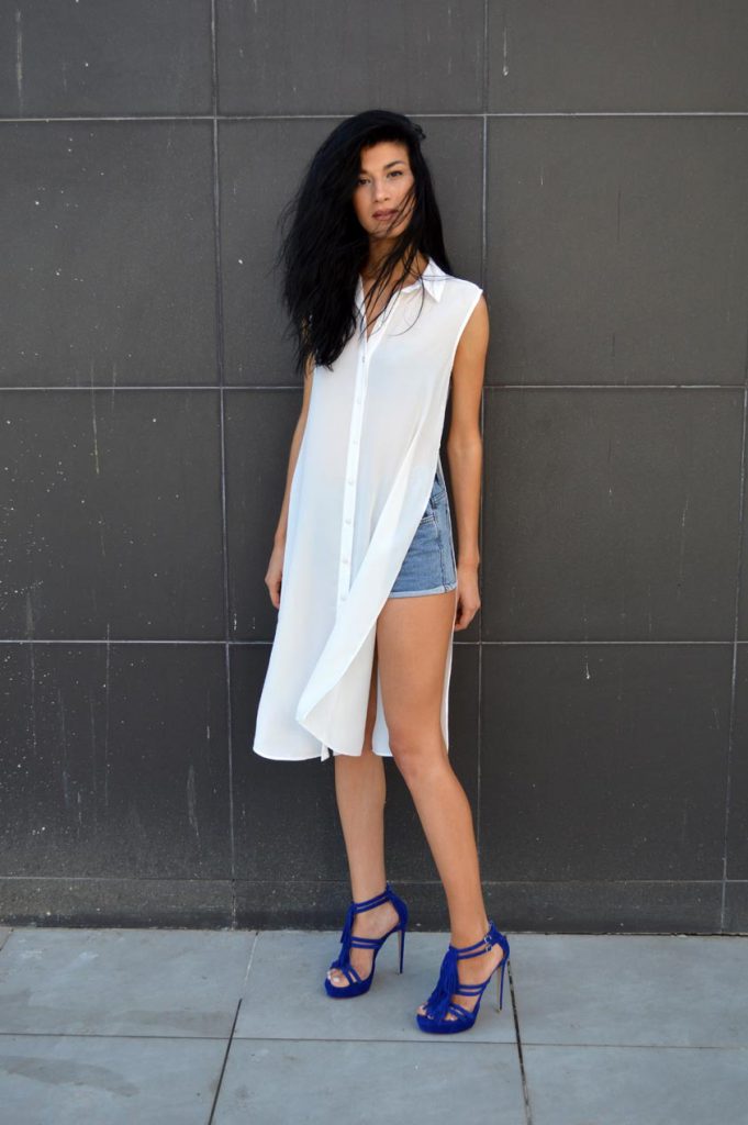 - Під білий наряд надягати сині босоніжки – це досить сміливе рішення. Але якщо додати в образ синій пояс і клатч в колір взуття, тоді ви отримаєте шикарний і дорогий цибулю.