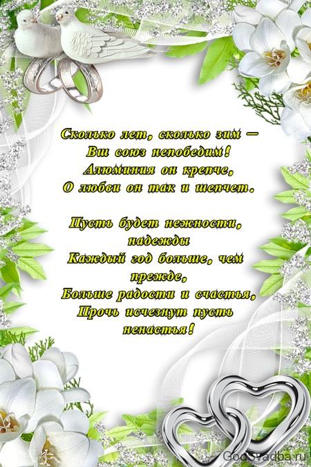 Запросіть самих близьких вам гостей: батьки, діти, онуки, сестра і брат. Кожен підготує короткі привітання у віршах, добре ще, щоб вони були смішні і прикольні. Таку річницю зазвичай святкують саме з жартівливим настроєм. Для чоловіка і дружини можна зробити алюмінієві корони, а також запропонувати їм прочитати один одному короткі вірші та обмінятися алюмінієвими кільцями.