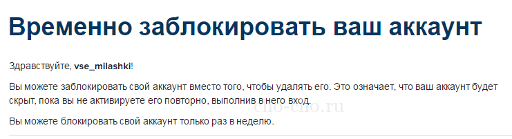 - вам запропонують зміна особистих даних і посилання «Тимчасово заблокувати мій акаунт» справа внизу на сторінці, так-так раніше тут була можливість видалити, а тепер лише блокування;