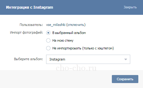 - далі Вам потрібно буде вказати у вікні місце, куди ви хочете помістити свої фотографії з инстаграма у ВК (можна вибрати будь-який альбом, стіну або не поміщати взагалі, тільки з хештегом);