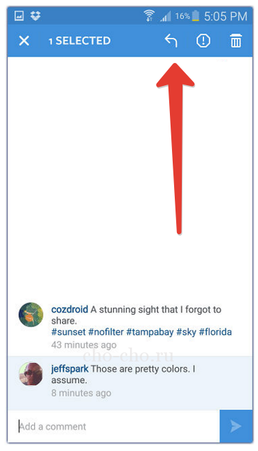З часом Instagram (всі статті про цієї соціальної мережі ви знайдете тут) вдосконалився, і жити стало простіше. Тепер можна під потрібним фото поруч з кнопкою лайка вибрати сусідню кнопку «Всі коментарі» і довгим натисканням пальця на потрібне повідомлення, на яке хочеться відповісти, викликати меню, де вибрати функцію «відповісти» (зверху праворуч з’явиться стрілка). Instagram сам подбає про те, щоб проставити нікнейм людини, а вам залишається тільки написати потрібний текст.
