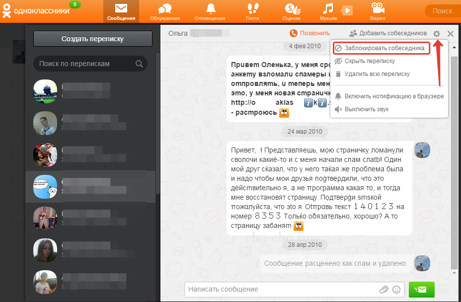 - Через діалоги. Шлях: кнопка «Повідомлення», через яку перекине на діалоги з усіма користувачами. Зліва будуть списки контактів, праворуч — самі діалоги. Потрібно буде зліва знайти неугодного користувача, вибрати його і натиснути «Заблокувати» в правій частині вікна над діалогом з ним. Користувач полетить в бан;
