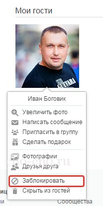 - Гості. Ще один спосіб — в меню «Гості», яке можна знайти через блок «Події» на вашій сторінці зліва, відшукати надоедалу, навести на нього курсор миші і в випадаючому списку вибрати «Додавання гостя в чорний список». Вуаля!