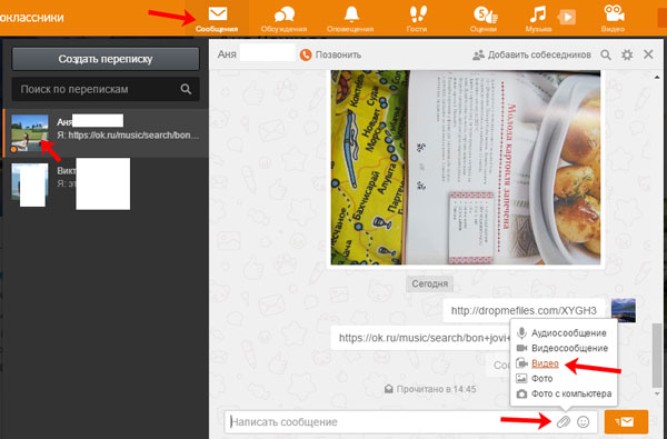 Після того, як ви завантажили потрібну відеозапис на сайт, перейдіть в меню «Повідомлення». У стовпці зліва відкрийте діалог з тим другом, якому хочете відправити відео. Далі у поле для введення тексту, натисніть на значок скрепочки та виберіть з меню пункт «Відео».