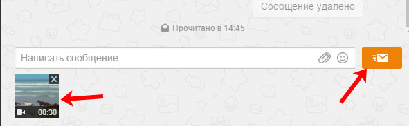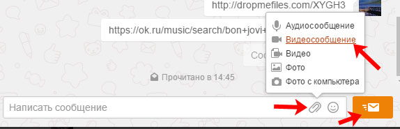 В Однокласниках ви також можете надіслати відеоповідомлення іншому користувачеві. Для цього в поле для введення тексту клікніть по скрепочке і виберіть відповідний пункт. Запишіть повідомлення та відправите його другові.