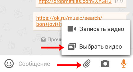 У поле для введення тексту, натисніть на значок скрепочки і виберіть зі списку «Вибрати відео».