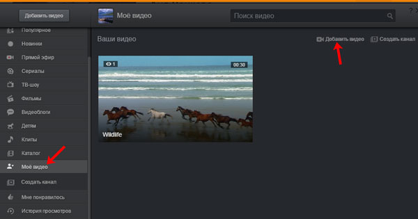 Тепер в меню зліва виберіть пункт «Моє відео». Знайдіть на сторінці кнопку «Додати відео» і клацніть по ній.