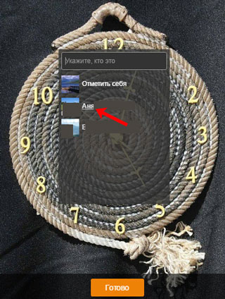 Якщо фото будуть зображені люди, сайт визначить їх особи автоматично, і з’являться невеликі віконця з написами: «Хто це?», «Відмітьте друга» та інше. Клацніть у полі над потрібною людиною, і виберіть його зі списку.