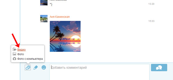 Якщо Вам потрібно додати фото в обговорення, наприклад, це може бути конкурс в якій-небудь групі, тоді знову перейдіть у відповідний пункт меню. Знайдіть в колонці зліва необхідну запис фото або відео і клацніть по ньому. Далі, ліворуч від поля для введення коментарів, натисніть на значок скрепочки і виберіть пункт «Фото» або «Фото з комп’ютера».