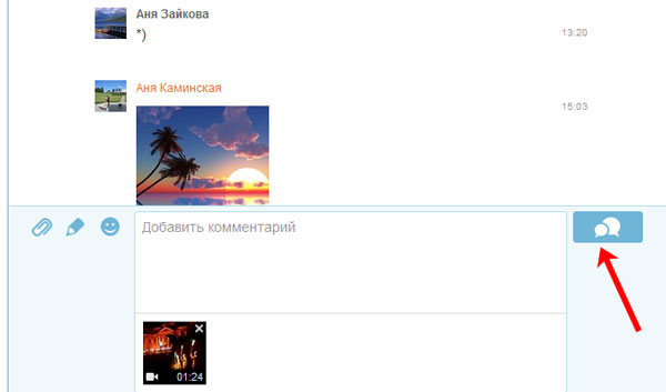 Відео в Обговорення додаються за тим же принципом, що і фото. Тільки, натиснувши на скрепочку, виберіть пункт «Відео».