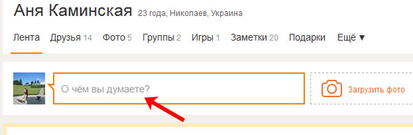 Для того щоб додати в обговорення текст або музику, відкрийте головну сторінку свого профілю і клацніть мишкою в поле «Про що Ви думаєте?».