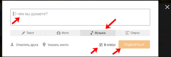 З’явиться наступне вікно. Введіть потрібний текст, можете залишити галочку в полі «статус» та натисніть кнопку «Поділитися». Якщо ви хочете додати музику, натисніть на відповідну кнопку і виберіть зі списку пісню.
