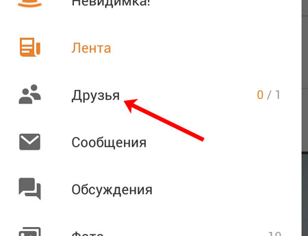 Для тих користувачів, хто заходить в Однокласники через мобільний додаток на телефоні, щоб додати друга в Однокласниках, потрібно відкрити програму. Далі в бічному меню клікніть по пункту «Друзі».