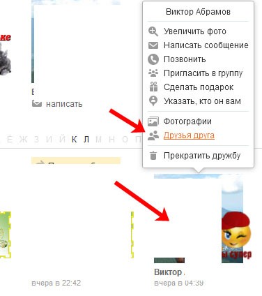 Тепер виберіть людину, з вже наявного в списку, наведіть на нього курсор миші і клацніть в меню за пунктом «Друзі одного».