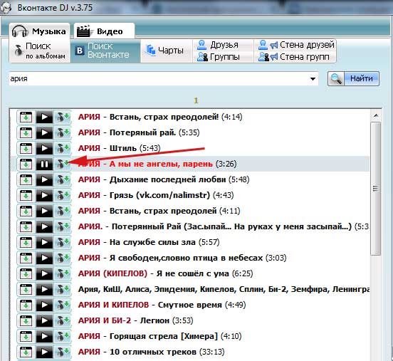 Після того, як в пошук ми введемо потрібну нам пісню або групу, нам тут же видасться список пісень. Щоб скачати одну з них, досить натиснути крайню зправа кнопку біля пісні.