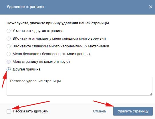 В наступному віконці ми можемо вказати причину видалення сторінки, також написати невелике повідомлення і розповісти про це друзям. Робиться це все, звісно, за бажанням: