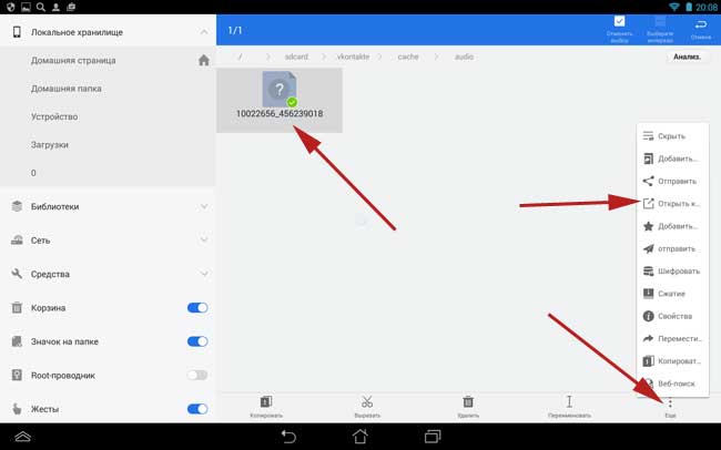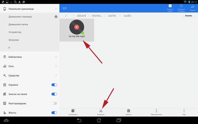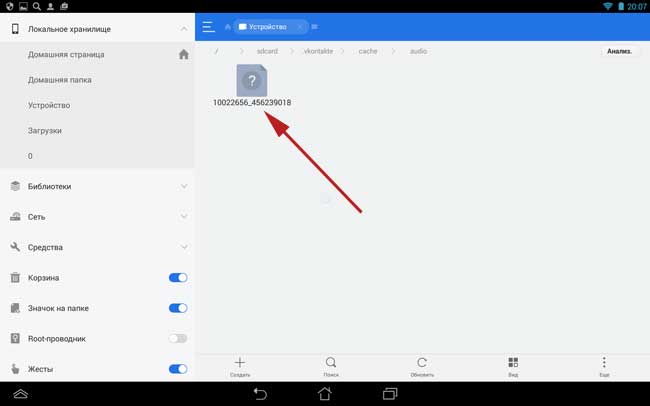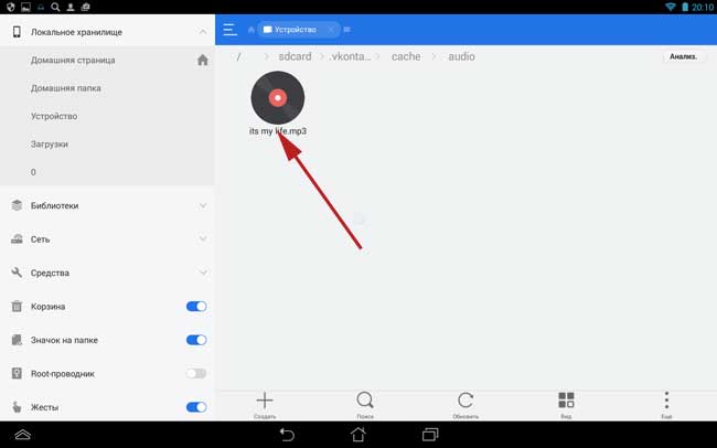 Тепер я трохи коротко спробую пояснити, що ми будемо робити. Справа в тому, що, коли ми запускаємо програвати яку-небудь пісню онлайн, вона не відтворюється десь на віддаленому сервері, вона відтворюється з нашого пристрою. Для цього додатком створюється тимчасовий файл, що зберігається в кеші на жорсткому диску нашого пристрою. У зв’язку з цим нам лише потрібно буде запустити через мобільний додаток потрібний музичний файл Вконтакте. А далі за допомогою файлового менеджера знайти потрібний файл в кеші, перейменувати його в назву пісні з розширенням mp3, а після перемістити в папку з нашою музикою на телефоні або планшеті.