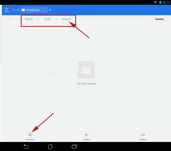 Заходимо в потрібну нам папку або створюємо її заново, в будь-якому місці за бажанням (у мене це папка «Музика»). В потрібній папці в нижньому меню натискаємо на кнопку «Вставити»: