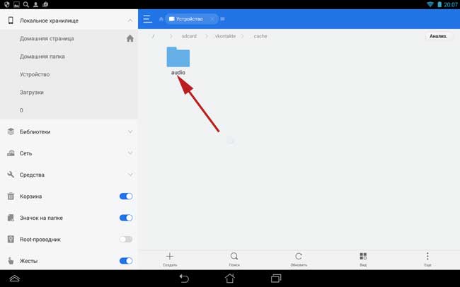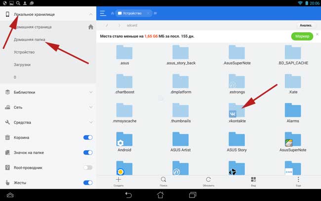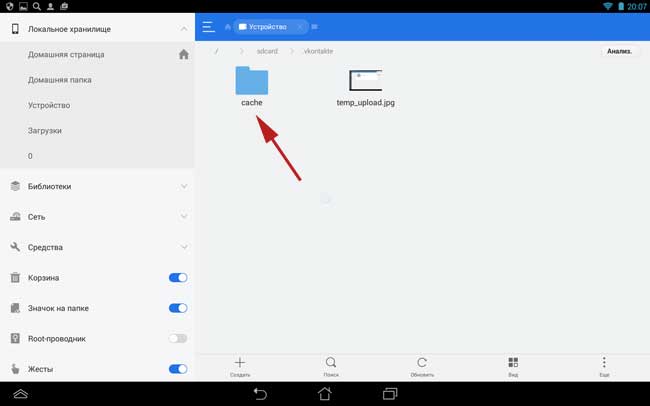 Доки показ прихованих файлів ми вже включили, нам залишається лише знайти тимчасовий файл. Для цього ми заходимо знову в наш провідник в «Локальне сховище» — «Локальну папку». Знаходимо там папочку vkontakte.