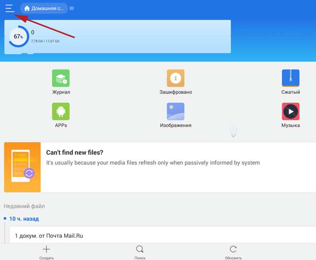 Заходимо у встановлений додаток файлового менеджера і натискаємо на меню у вигляді трьох горизонтальних смужок:
