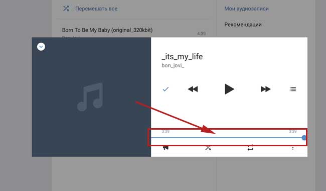 Пісня запускається на весь екран, нам треба почекати, поки вона повністю завантажиться і смужка плеєра стане синім, а не сірою. Це потрібно для того, щоб весь трек повністю завантажився в кеш тимчасовий файл: