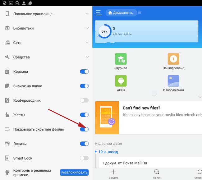 Гортаємо з’явилося ліве меню в самий низ і вмикаємо пункт «Показувати приховані файли». Для цього переміщуємо перемикач зліва направо, щоб смужка стала синього кольору.