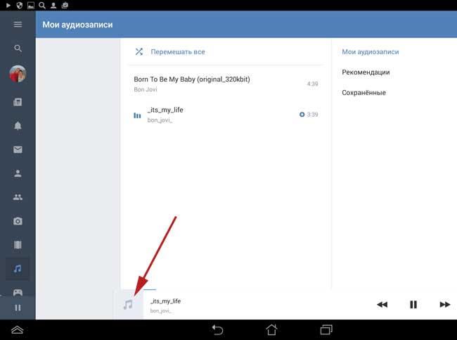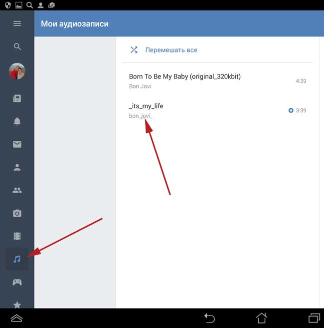Запускаємо мобільний додаток Вконтакте і знаходимо ту пісню, яку хотіли завантажити. Особисто я заходжу в «Аудіозаписи» (це значок ноти в лівому меню) і натискаю на потрібну мені пісню: