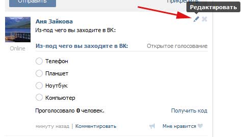 У підсумку, у вас на стіні створиться опитування. Я помітив якийсь недолік у цій справі. Крім назви теми опитування, у нас ще дублюється цей же текст в якості запису. Виглядає це не зовсім красиво. У нас є можливість виправити таку «капость». Підводимо мишу в правий верхній кут і тиснемо на «олівчик», який у нас символізує кнопку «Редагувати».