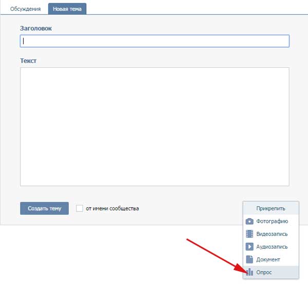 Крім того, що ми можемо додавати опитування на стіну групи, Вконтакте є можливість вставляти їх в нові обговорення або у вже існуючі.