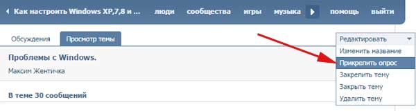 Натискаємо на обговорення. У вкладці «Перегляд теми» у правому верхньому куті натискаємо на кнопочку «Редагувати» і вибираємо пункт «Прикріпити опитування».